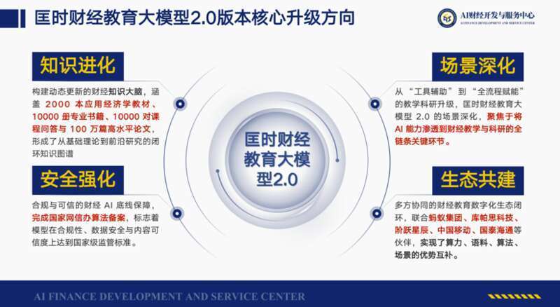 据悉,匡时财经教育大模型2.0相较于1.0,在知识进化、安全强化、场景深化、生态共建四大领域又有了新的突破。该平台构建了一个可持续更新的财经“知识大脑”,涵盖2000+应用经济学教材、10000+专业书籍、10000+课程问答对与100万+篇高水平论文,形成闭环知识体系。目前模型已通过国家网信办算法备案,内容生成过程可追溯、结果可验证,其能力已深度融入财经教学、科研及管理全流程。